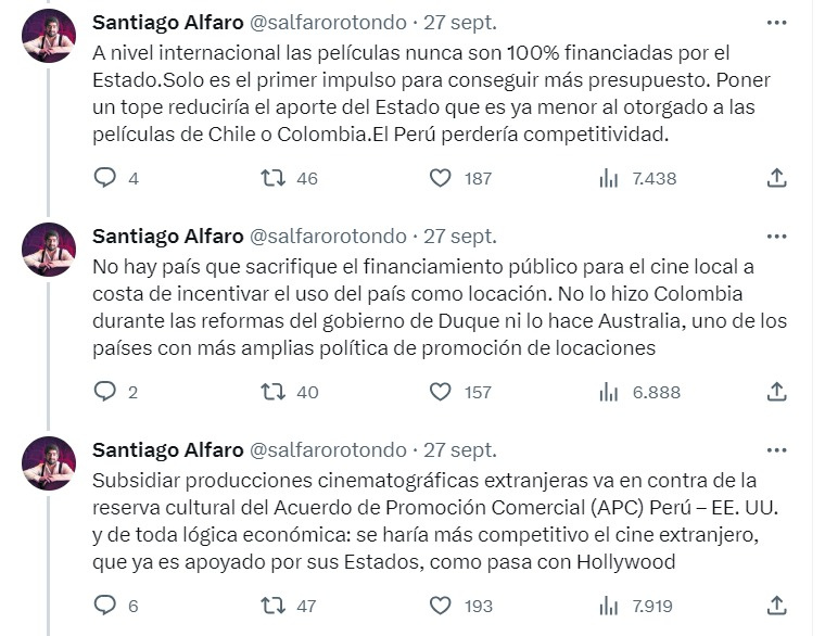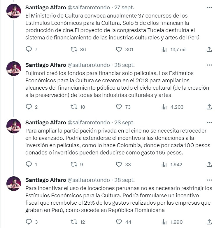 Otra cosa: en ningún momento explica por qué sería necesario recortar los estímulos económicos para promover la inversión extranjera. Al respecto, recomiendo leer este completísimo hilo de Twitter de Santiago Alfaro, ex director general de Industrias Culturales del MINCUL, y del cual destaco lo siguiente:
