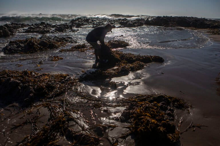 Son las siete de la mañana y el viento frío sacude las toneladas de algas que fueron tendidas en la arena para ser secadas al sol. Con sus manos curtidas, Julio César Uchuylla se acerca a ellas y forma veloz un enorme montículo, lo levanta de un tirón y se lo echa al hombro. Sin perder el ritmo, lanza la carga en la tolva de una camioneta y vuelve por más. Tiene 60 años y toda una vida entregada al mar.
