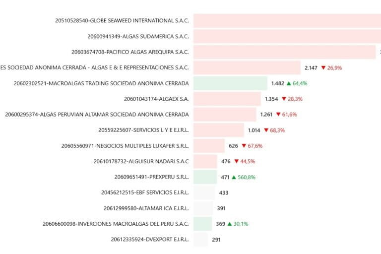 Díaz Saldaña confirmó que al cierre de 2024 los certificados de origen y transporte tramitados ante su despacho revelaban que se habían procesado más de 60 000 toneladas de algas para su venta en el extranjero. Sin embargo, los registros aduaneros de Sunat reportaron la salida de apenas 12 000 toneladas. “Si nosotros sabemos que hay una producción de 60 000 toneladas, ¿por qué solamente han declarado 12 000? Los datos de salida de macroalgas tienen que concordar con la cantidad de materia prima recibida. En todo caso, Sunat podría rastrearlo y ver qué sucede”.